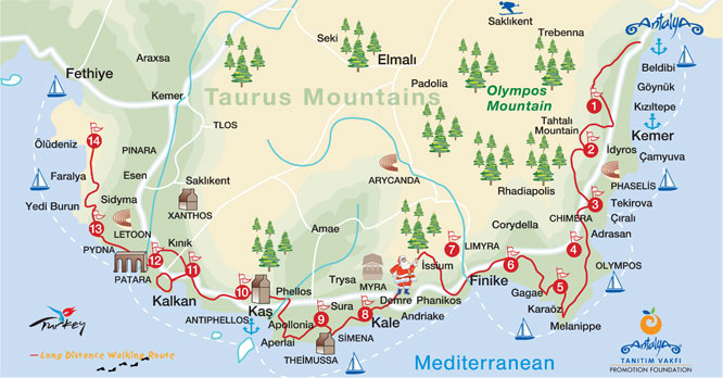 The Lycian way is a 509 km way-marked footpath around the coast of Lycia, from Antalya to Fethiye. The route is graded medium to hard, it is not level walking, but has many ascents and descents as it approaches and veers away from the sea. It is easier at the start near Fethiye and gets more difficult as it progresses. We recommend walking the route in spring or autumn; February-May or September-November. Summer in Lycia is hot, although you could walk short, shady sections. The route is mainly over footpaths and mule trails; it is mostly over limestone and often hard and stony underfoot. On the last part of the route, and in Patara, Kalkan, Kas, Myra, Finike, Adrasan, Olympos, Cirali and Tekirova, you can stay in pensions or small hotels. On other nights, you may stay in a village house, or camp out. There are plenty of camping places with nearby water mentioned in the book; you do not have to ask permission to camp out.